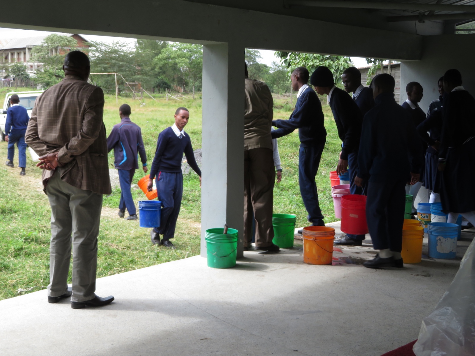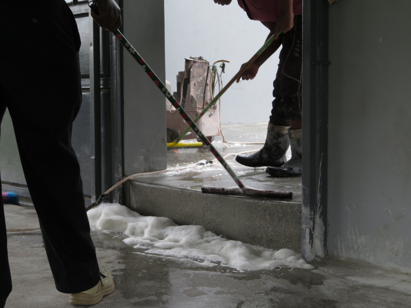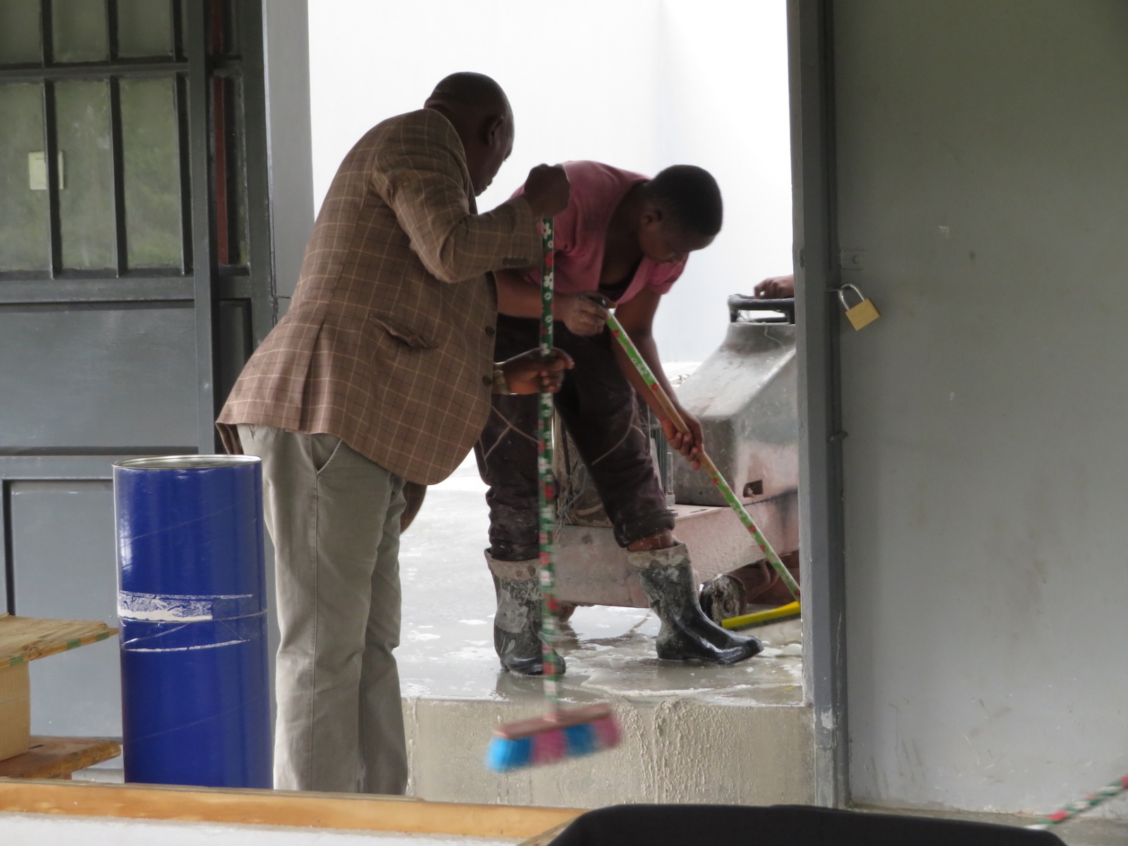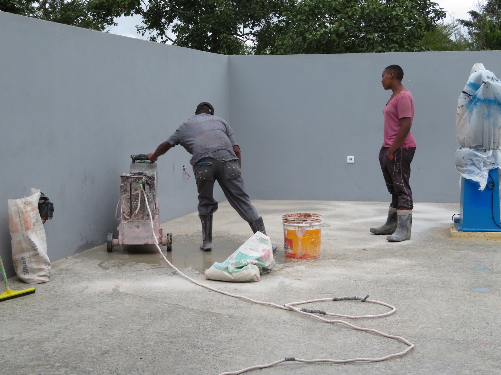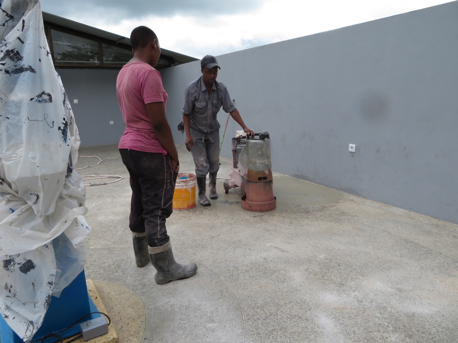 When I learned that the contractor who was to have applied the sealant today had not read the back of the can nor measured the floor before providing his quote, hoping to use just 5 liters instead of the minimum 15 for the 70 square meters, Thomas and I raced to town, arriving just 8 minutes before the shop closed in order to purchase an additional 3 containers.