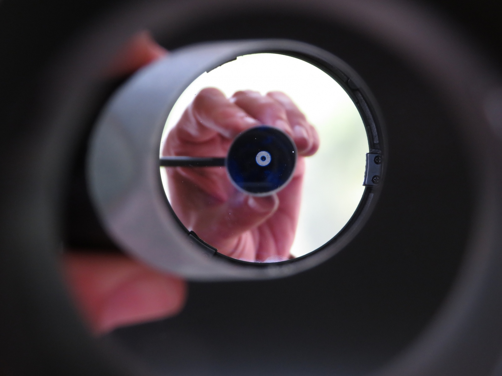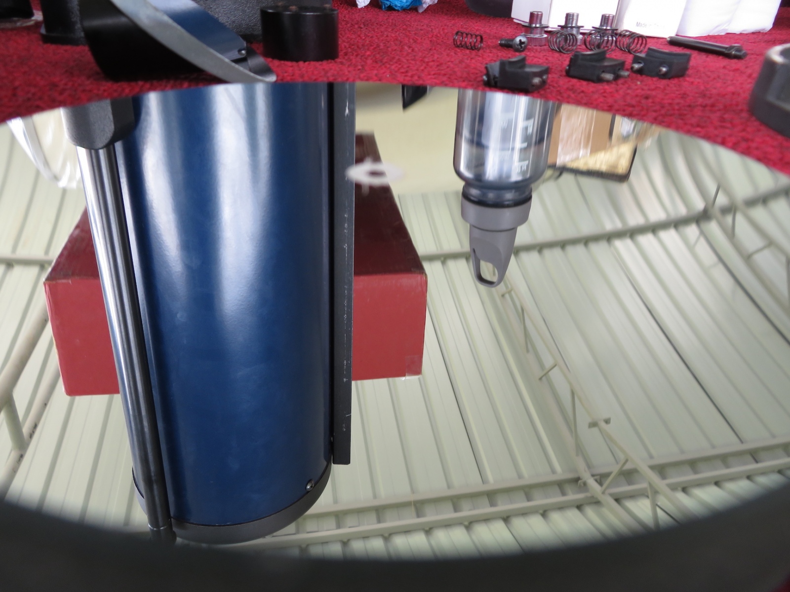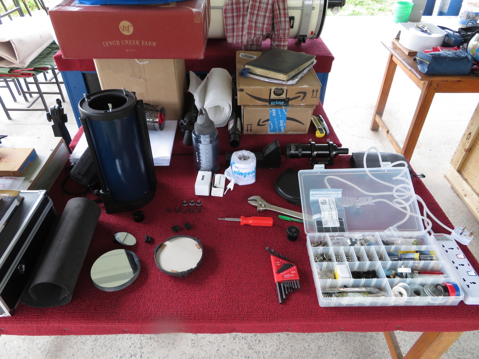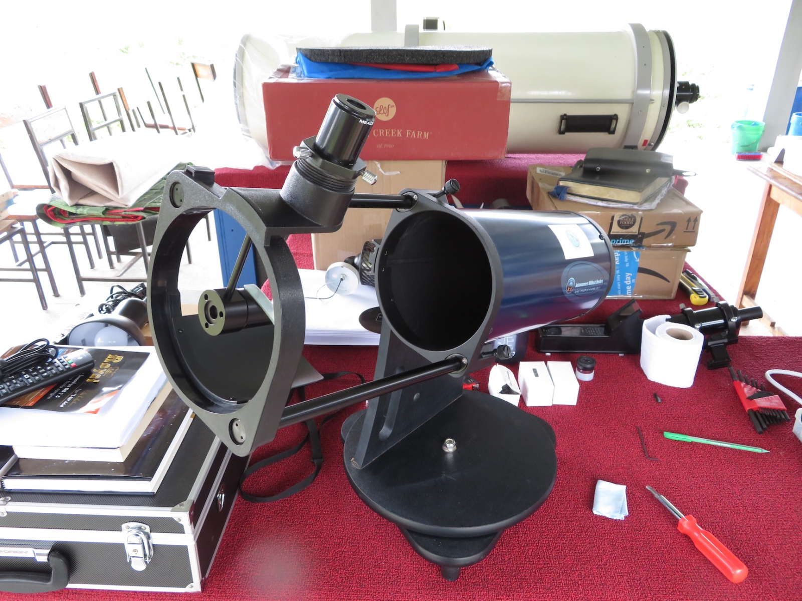 While this was happening, I set up shop on a table outside and rebuilt a 5″ reflector, removing and cleaning, then collimating both mirrors.